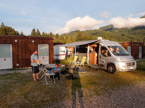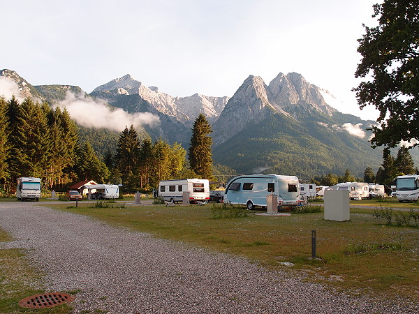 Im Anschluß machten wir uns auf den Weg zum 5*-Platz des Campingresort Zugspitze. Das Einchecken ging recht flott und wir fuhren zu unserem zugewiesenen Platz. Dort bauten wir in strömendem Regen unsere Sachen auf und verbrachten, nachdem wir das recht geräumige Privatbad inspiziert hatten, den restlichen Nachmittag im Wohnmobil. Für den Abend kündigten sich noch Freunde an, die auf den Weg in den Süden noch einen Zwischenstopp einlegen mochten. Ab 18 Uhr war Schluß mit Regen und die Sonne kam nochmal raus. Bis spät abends saßen wir nach dem Grillen noch draußen und planten den nächsten Tag.