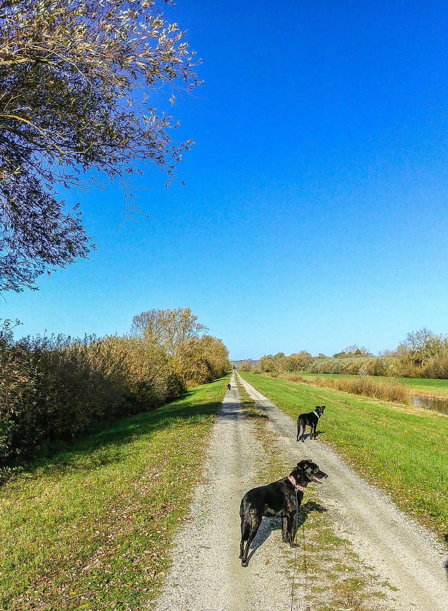 Wir spazieren auf einem Damm zwischen einem Kanal und dem Hídvégí-See entlang. Da links und rechts nur Wasser ist, lassen wir unsere Hunde frei laufen. Diese genießen es in vollen Zügen. Auf dem See versammeln sich massenweise Wasservögel und rechts im Kanal schwimmen Schwäne und Enten. Unsere Hunde haben zum Glück kein Interesse am Federvieh und schnüffeln lieber an Grashalmen und Büschen. Nach 4 km überqueren wir den Kanal über eine Brücke und gehen den Weg auf der anderen Seite wieder zurück. Ein Aussichtsturm verspricht noch mal einen schönen Blick über das Gebiet und wir schießen noch ein paar Fotos, bevor es zurück zum Wohnmobil geht.